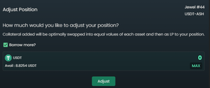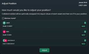 * **1** - In this section you can deposit either only USDT, only ASH, only the LP Token or a mix of USDT and ASH. It's up to you. JewelSwap will take whatever you entered and balance it out to create more LP Tokens. If you deposit only USDT, the correct amount will be swapped to ASH, in order to create the LP Token.
