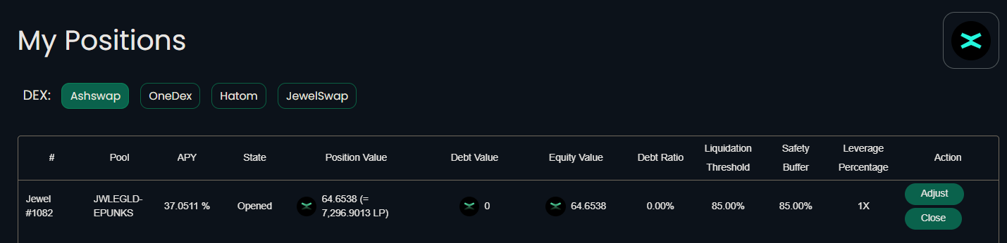 Go to "Portfolio" > "My Positions" to view the list of your opened positions. Switch between the DEX tabs to view the positions of the respective DEX. (Eg. ASHSWAP, ONEDEX).
