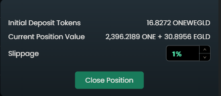 Here you will see your opened Farm position, the current APY, the position value ([shown in just one token](https://docs.jewelswap.io/multiversx/liquidation#why-does-my-position-value-fluctuate) and also as the amount of LP tokens), the debt (if leverage is used, otherwise it is zero), and to the right the safety buffer and the leverage used.